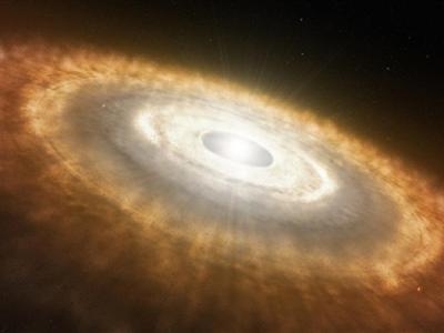围绕年轻恒星形成行星(艺术家绘图)。地球深处氪同位素测量显示,水、碳和其他挥发...