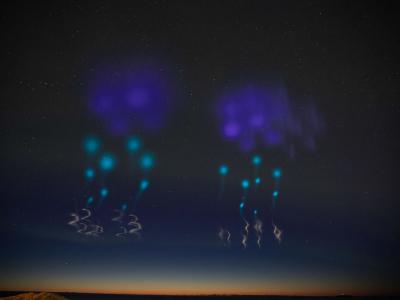 两枚火箭释放的蒸汽示踪剂形成的彩色云层使科学家能够测量风向在安多亚航天中心测试...