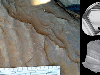 左图:砂岩地层(用尺子表示);右图:锆石颗粒(显微图像)花岗岩浮力岩(神秘的地...