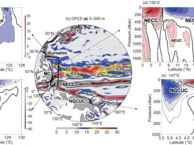 WOA18多年代水文数据反演的地转流((a), (b), (d), (e), 单位为cm s−1)和OFES...
