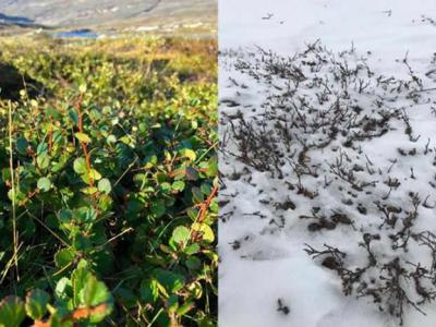 图中是夏天和冬天的矮桦树,冬季它仍能从积雪中钻出来,目前,美国科罗拉多大学博尔...