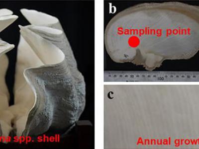(a)亚化石砗磲壳体;(b)沿切割线切开得到砗磲生长横截面;(c)砗磲年生长纹层...