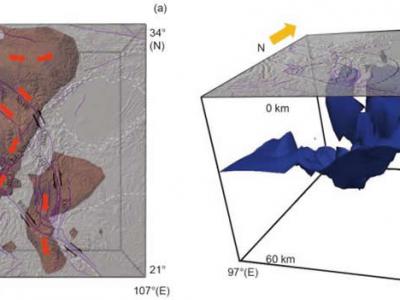 青藏高原东南缘两条壳内低速带(灰色阴影区域, 对应于壳内Vsv=3.4km/s的等值面) (a)...