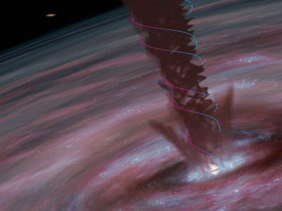 艺术家对ESO320-G030星系中心超大质量黑洞周围螺旋状磁风的印象。彩色线条显示风的...