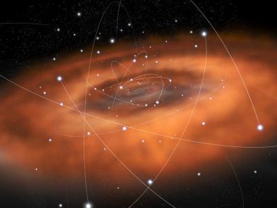 银河系星系中心的插图,显示了我们的超大质量黑洞被气体盘和星团包围。(图片来源:...