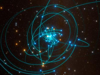 一群年轻的恒星紧紧围绕着银河系的超大质量黑洞人马座A*运行。这里的模拟显示了这些...