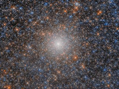 一个球状星团,看起来像是由许多白色、黄橙色和蓝色的闪亮恒星组成的非常密集的球状...