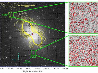 英国施密特望远镜拍摄的NGC 5128的档案光学图像(波长468 nm)覆盖了两个研究区域的...