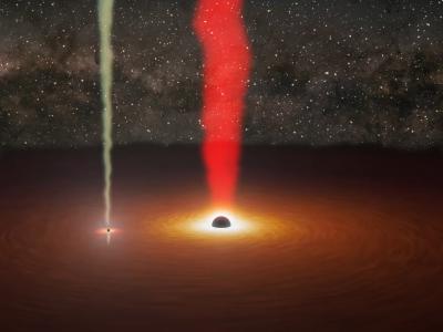 黑洞围绕彼此运行。两个黑洞都有与其相关的喷流:较大的黑洞呈红色,较小的黑洞呈黄...