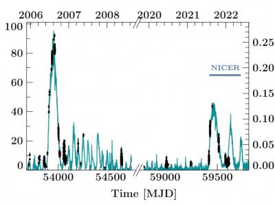 EXO 2030+375在30–50 keV波段的长期光照曲线,如黑色INTEGRAL-ISGRI和青色Swift B...