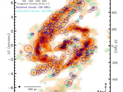 NGC 613的12CO(1-0)综合强度图,其中356个GMC被识别为重叠的。已解析的云显示为深...