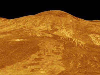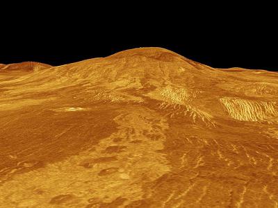 这张由计算机生成的金星表面三维模型显示了Sif Mons火山,该火山正显示出持续活动的...
