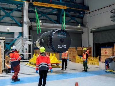 SUV大小的LSST相机被提升到鲁宾天文台内的地板上方。(图片来源:uux.cn/Olivier B...