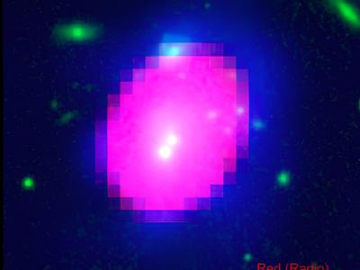 Abell 2566的RGB(三色)图像,通过将在1.4GHz下测量的发射与VLA C配置(红色)、P...