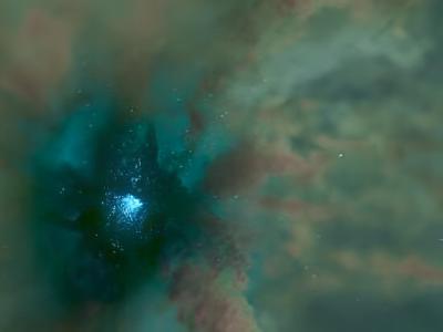 通过模拟再现了在巨大分子云中形成的星团。此图像基于模拟。蓝点代表单个恒星。深色...