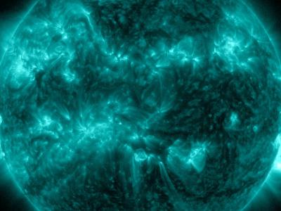 太阳的假彩色图像,以蓝绿色显示,从其表面喷出漩涡状的耀斑。(图片来源:uux.cn/...