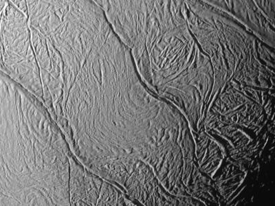 这张土星卫星恩克拉多斯的特写照片朝向月球的终止点(从白天到夜晚的过渡),显示了...