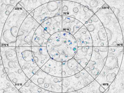 谷神星北极区地图。颜色区域是在谷神星一年中持续被遮蔽的区域,因此非常寒冷。谷神...