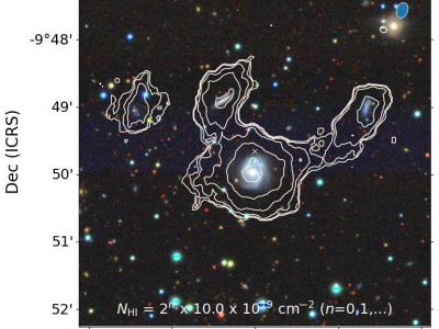 附近的四个星系是MeerKAT发现的49个星系中的一部分,如白色轮廓所示。其中三个星系...