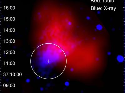 信噪比CTB 87的双波长图像:红色的NVSS 1.4 GHz连续射电图像和蓝色的钱德拉X射线(0...