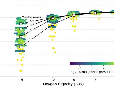 作为岩浆海洋氧逸度的函数,与地球总存量相比,地球大气中氮的分数。随着氧逸度的降...