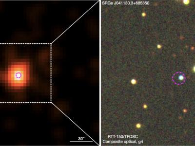 左图:SRGeJ0411在0.3–2.3 keV能量带的假彩色X射线图像,来自SRG/eROSITA的四次全天...