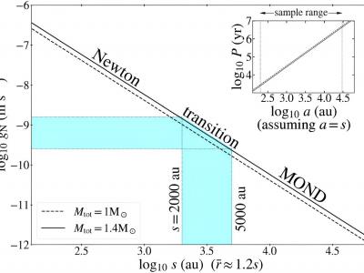 该图显示了与牛顿-蒙德加速度跃迁范围相对应的天空投影间距s的范围。插图显示了在C...