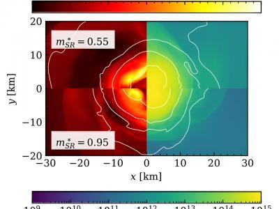 从上面看,比较中子星合并后大约5毫秒的两个不同模拟(顶部和底部)的密度(右)和温度...