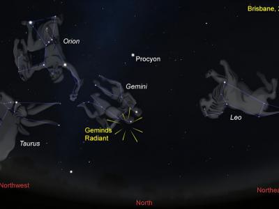 当辐射达到顶点(在北方天空达到最高点)时,可以看到最多的流星,如图所示的布里斯班...
