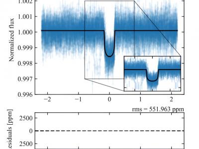 上图显示了来自TESS的TOI-4377 b的相位折叠光变曲线,单个通量观测值用蓝色表示,较...