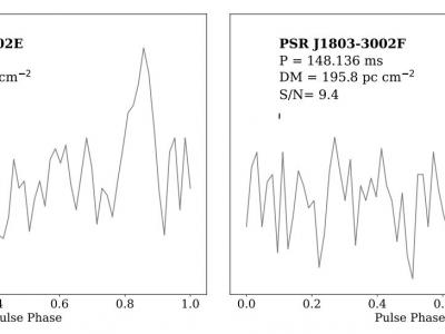 在L波段NGC 6522的TRAPUM观测中发现的两颗脉冲星的轮廓。学分:uux.cn/arXiv (2023)...