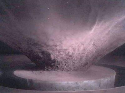 在美国宇航局艾姆斯垂直靶场进行超高速撞击实验时产生的喷出物幕的侧视图。该实验旨...