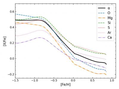 元素丰度[X/Fe]的演变,包括O、Mg、Si、S、Ar和Ca(以及[α/Fe]≦([O/Fe]+[Mg/Fe]+[...