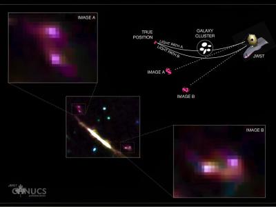 融合的星系被JWST占领了。爱因斯坦的引力透镜效应产生了同一个系统的两幅图像A和B。...