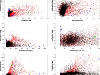 在四颗大行星和m = 1.5 M⊕,a = 250 au,q = 195 au,i = 30的KBP的引力影响下,在...