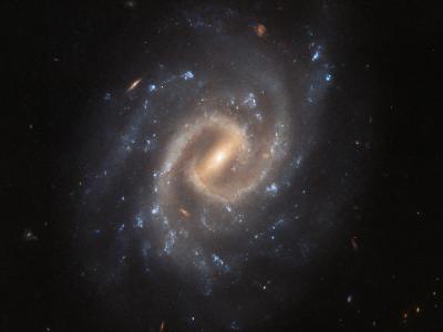 一个螺旋星系正对着:两个明亮的旋臂从一个棒状物延伸出来,棒状物从中心发光。较弱...