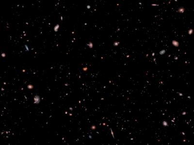 一张由数千个不同形状和大小的星系组成的图像,呈现不同的红色、黄色、蓝色和白色。...