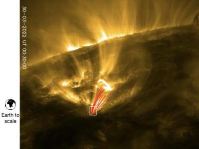 2022年3月30日在EUV拍摄的照片,显示了太阳的部分截面,有100万度的气体。红色的路...