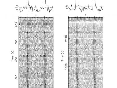分别于(a)2022年4月19日和(b)9月5日在GBT 1,500 MHz上对PSR J0212+5321进行的时间...