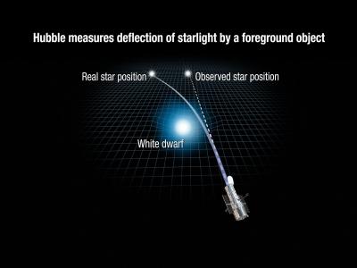 显示前景白矮星的重力如何扭曲空间并弯曲来自其后方遥远恒星的光线。图片来源:NAS...