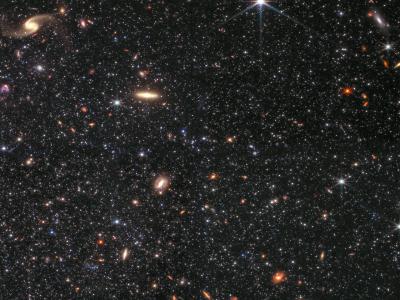 由韦伯太空望远镜近红外相机(NIRCam)所拍摄,图像中显示了WLM中无数恒星以及数十...