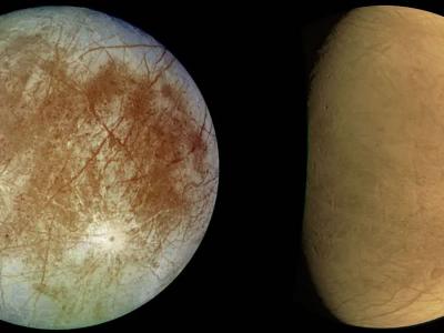 左图是伽利略号探测器拍摄的木卫二近似自然色的图象,右图是朱诺号拍摄的原始图象。...