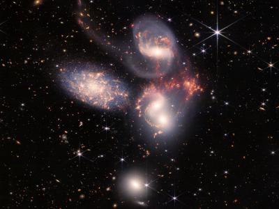 斯蒂芬五重星系的巨大拼接图是美国宇航局詹姆斯-韦伯太空望远镜迄今为止最大的图像...