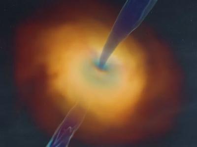 快速旋转的黑洞吸积盘和由此产生的黑洞动力射流的3D渲染。来源:uux.cn/Ore-Gottli...