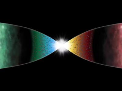 一道明亮的白光位于中心,向左右两侧喷出五颜六色的气体和粒子,右边是暖色,左边是...
