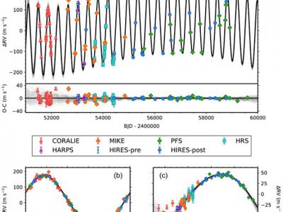HD 28185系统:图(a)显示了随时间变化的观测径向速度(RV);图(b)显示了HD 28...