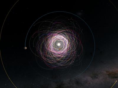 这张图片显示了许多围绕太阳的循环和重叠轨道,所有这些轨道都有不同的颜色(以区分...