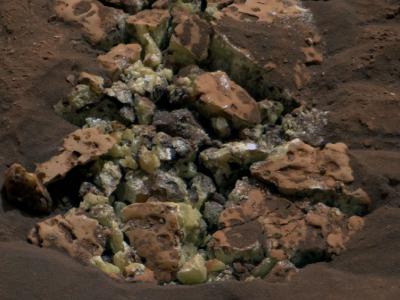 美国国家航空航天局的好奇号火星车在驶过一块岩石并将其敲开后,意外发现了黄色硫晶...