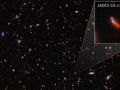 星系JADES-GS-z14-0,距离地球338亿光年。(图片来源:uux.cn美国国家航空航天局、...