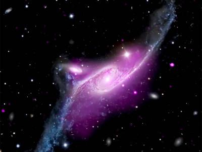 棒旋星系NGC 6872正在与左上角的一个较小星系相互作用。较小的星系可能已经从NGC 6...